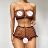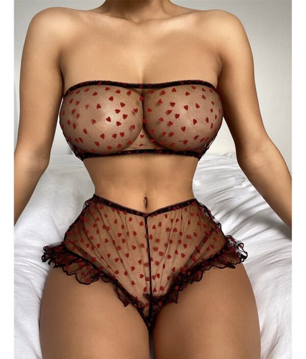 El bralette con detalles en corazones y volados añade un toque de sofisticación al diseño, mientras que el culotte less proporciona una silueta favorecedora, realzando las curvas de manera sutil y efectiva. Este modelo es una expresión de estilo, ideal para quienes buscan un lingerie que combine aspectos sensoriales y estéticos.